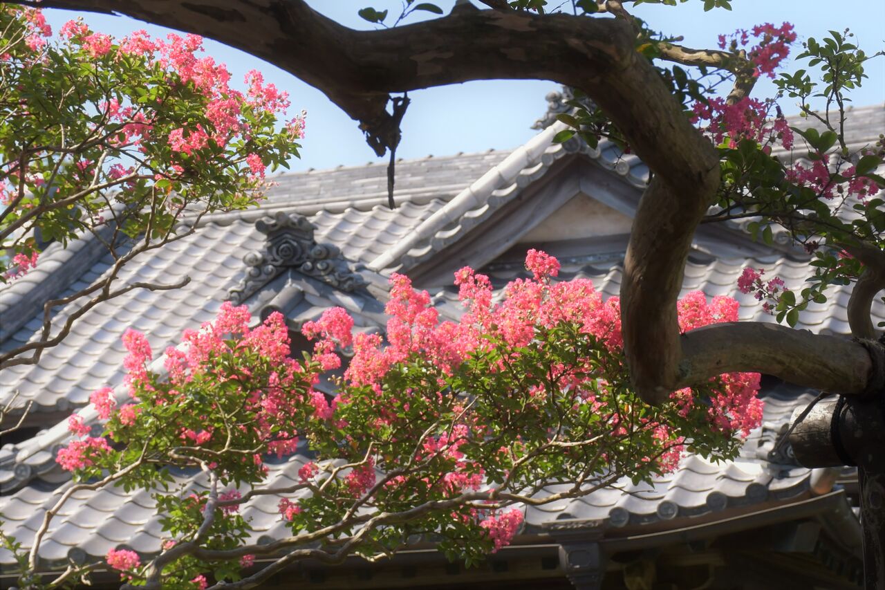 百日紅の鮮やかなピンク、屋根瓦の軽やかなグレイ、そして青空、其れ等を引き締める様な、黒味をおびた枝ぶりが印象的です。写真撮影では、ポイントになる何かを加える事も、大事ではと思い出しました。